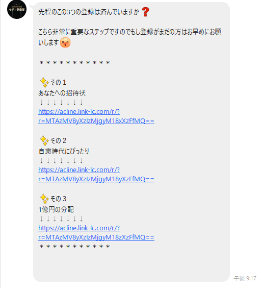 モダン倶楽部にLINE登録すると挨拶もそこそこに、3つに登録するように指示が来ました。その1のURLをタップすると、以前このブログでも検証した案件でした。